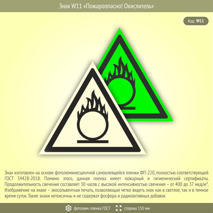 Знак W11 «Пожароопасно! окислитель» (фотолюминесцентная пленка ГОСТ 34428-2018, сторона 150 мм) в Пушкино купить