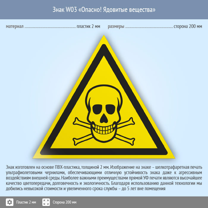 Знак W03 «Опасно! ядовитые вещества» (пластик, сторона 200 мм) в Пушкино купить