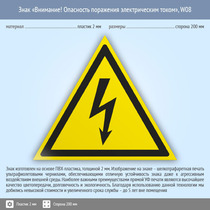 Знак W08 «Внимание! опасность поражения электрическим током» (пластик, сторона 200 мм) в Пушкино купить