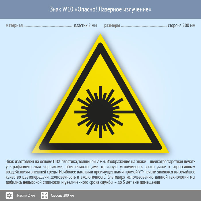 Знак W10 «Опасно! лазерное излучение» (пластик, сторона 200 мм) в Пушкино купить