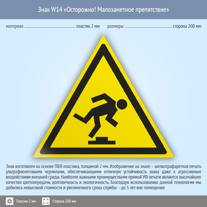 Знак W14 «Осторожно! малозаметное препятствие» (пластик, сторона 200 мм) в Пушкино купить