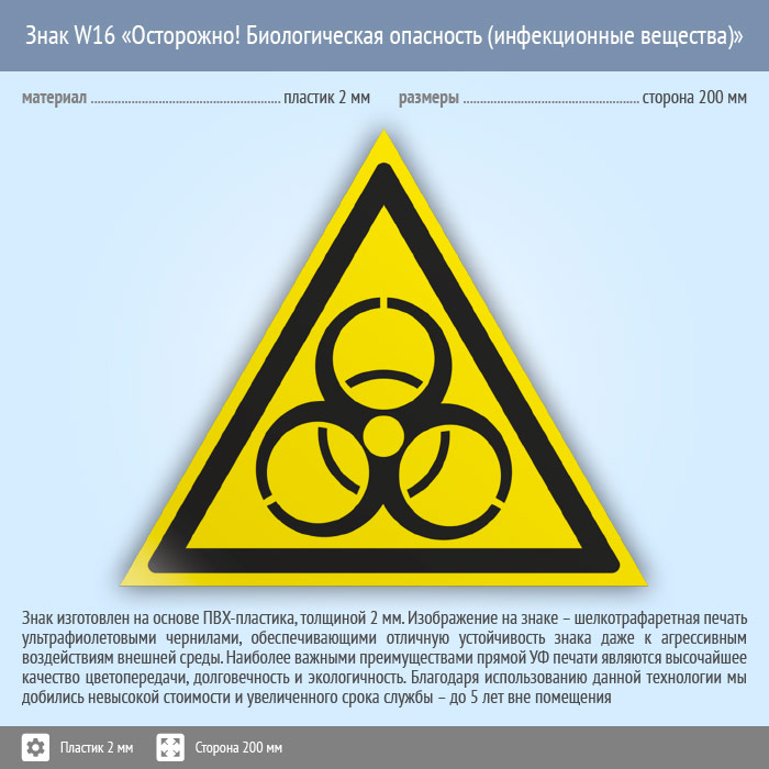 Знак W16 «Осторожно! биологическая опасность (инфекционные вещества)» (пластик, сторона 200 мм) в Пушкино купить