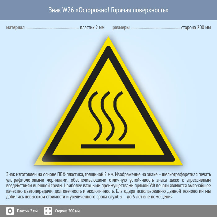 Знак W26 «Осторожно! горячая поверхность» (пластик, сторона 200 мм) в Пушкино купить