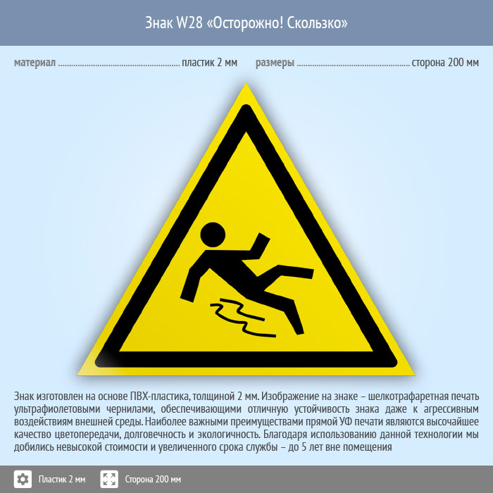 Знак W28 «Осторожно! скользко» (пластик, сторона 200 мм) в Пушкино купить
