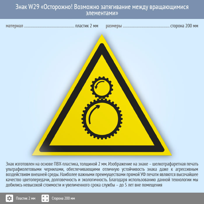 Знак W29 «Осторожно! возможно затягивание между вращающимися элементами» (пластик, сторона 200 мм) в Пушкино купить
