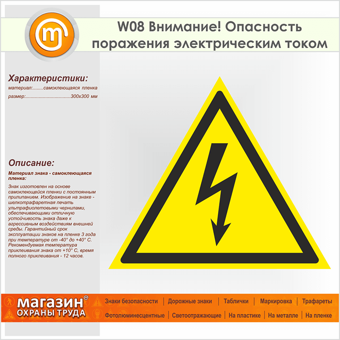 Знак W08 «Внимание! опасность поражения электрическим током» (пленка, сторона 300 мм) в Пушкино купить