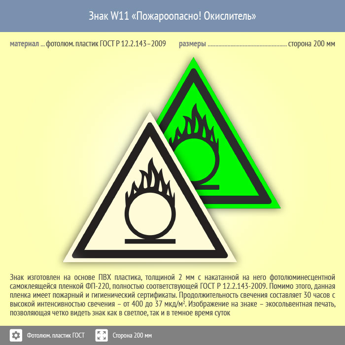 Знак W11 «Пожароопасно! Окислитель» (фотолюминесцентный пластик ГОСТ 34428-2018, сторона 200 мм) в Пушкино купить