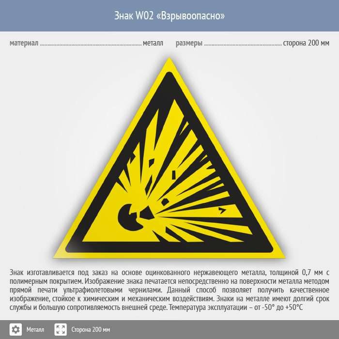 Знак W02 «Взрывоопасно» (металл, сторона 200 мм) в Пушкино купить
