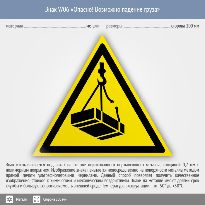 Знак W06 «Опасно! возможно падение груза» (металл, сторона 200 мм) в Пушкино купить
