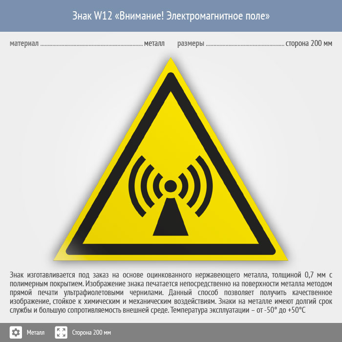 Знак W12 «Внимание! электромагнитное поле» (металл, сторона 200 мм) в Пушкино купить