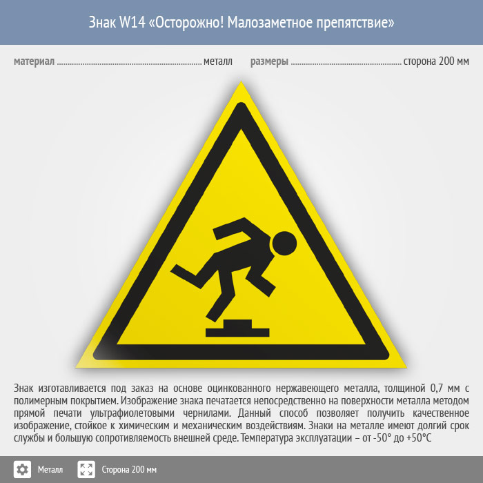 Знак W14 «Осторожно! малозаметное препятствие» (металл, сторона 200 мм) в Пушкино купить