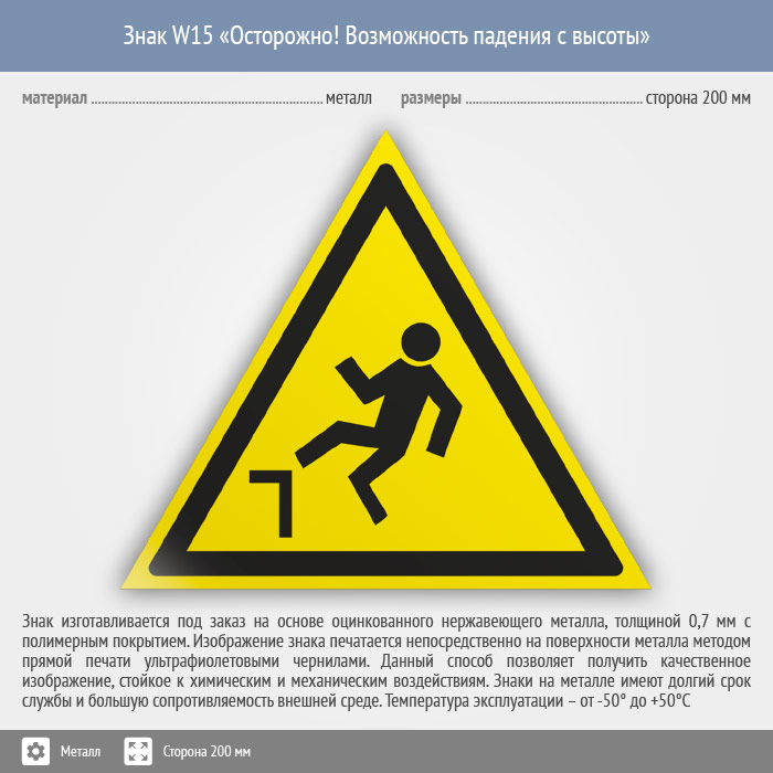 Знак W15 «Осторожно! возможность падения с высоты» (металл, сторона 200 мм) в Пушкино купить