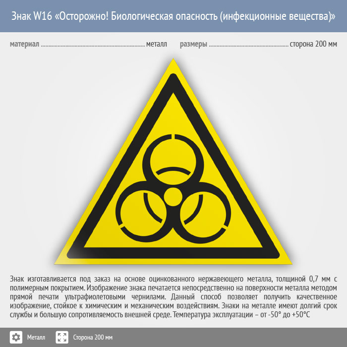 Знак W16 «Осторожно! биологическая опасность (инфекционные вещества)» (металл, сторона 200 мм) в Пушкино купить