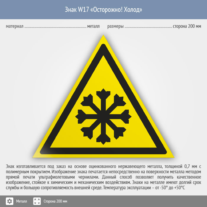 Знак W17 «Осторожно! холод» (металл, сторона 200 мм) в Пушкино купить