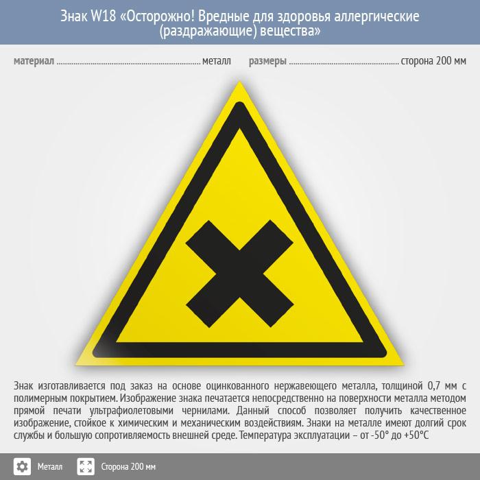 Знак W18 «Осторожно! вредные для здоровья аллергические (раздражающие) вещества» (металл, сторона 200 мм) в Пушкино купить