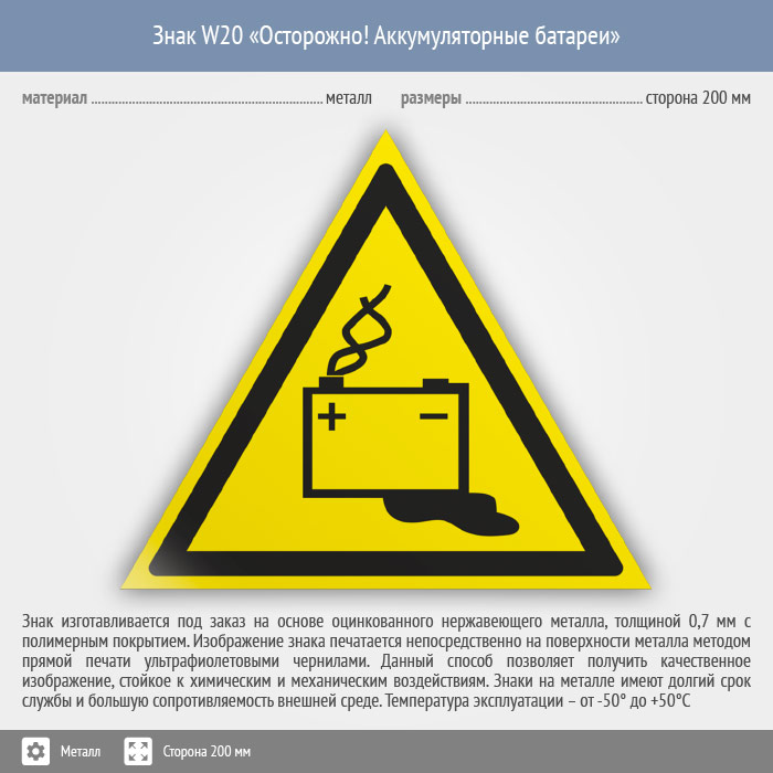 Знак W20 «Осторожно! аккумуляторные батареи» (металл, сторона 200 мм) в Пушкино купить