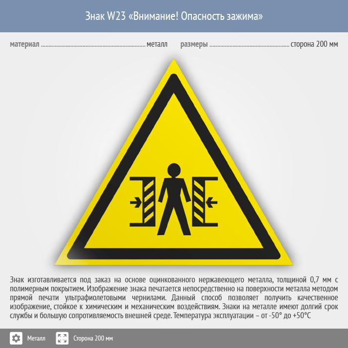 Знак W23 «Внимание! опасность зажима» (металл, сторона 200 мм) в Пушкино купить