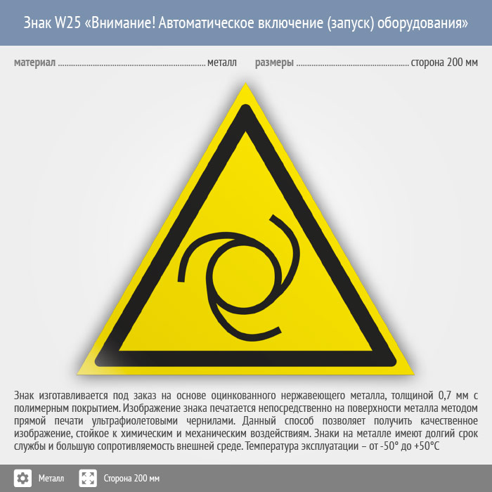 Знак W25 «Внимание! автоматическое включение (запуск) оборудования» (металл, сторона 200 мм) в Пушкино купить