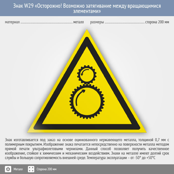 Знак W29 «Осторожно! возможно затягивание между вращающимися элементами» (металл, сторона 200 мм) в Пушкино купить