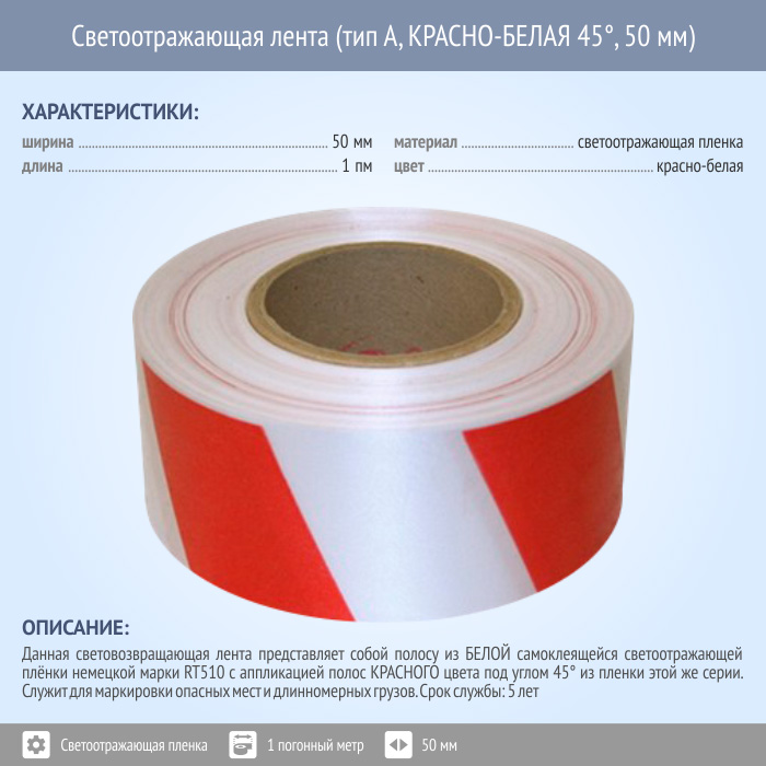 Светоотражающая сигнальная лента (тип А, КРАСНО-БЕЛАЯ 45°, 50 мм х 1 п.м.) в Пушкино купить