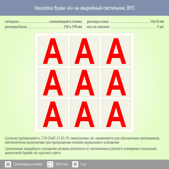 Наклейка буква «А» на аварийный светильник, B93 (пленка, 50х50 мм, блок 9 штук, 190х190 мм) в Пушкино купить