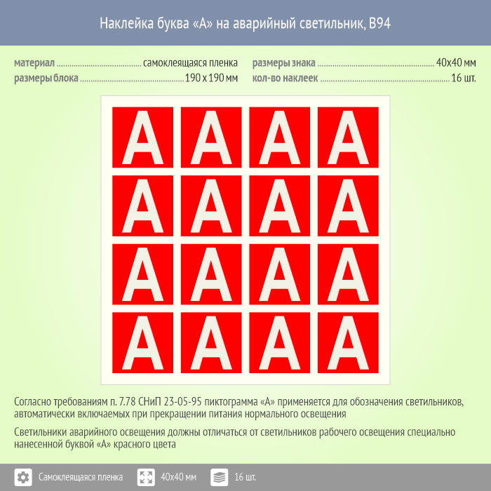 Наклейка буква «А» на аварийный светильник, B94 (пленка, 40х40 мм, блок 16 штук, 190х190 мм) в Пушкино купить
