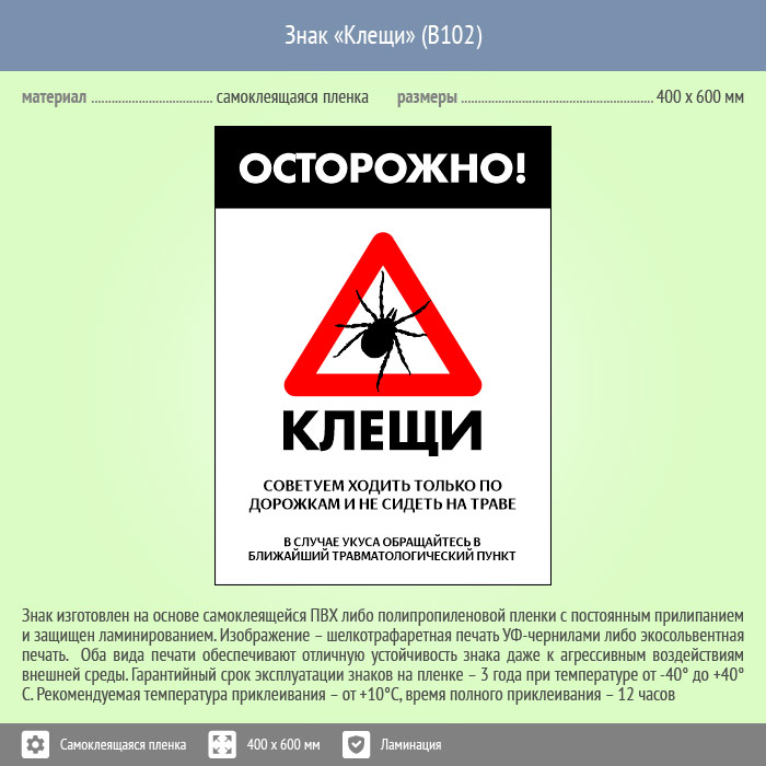 Знак «Осторожно! Клещи», B102 (пленка c ламинированием, 300х400 мм) в Пушкино купить