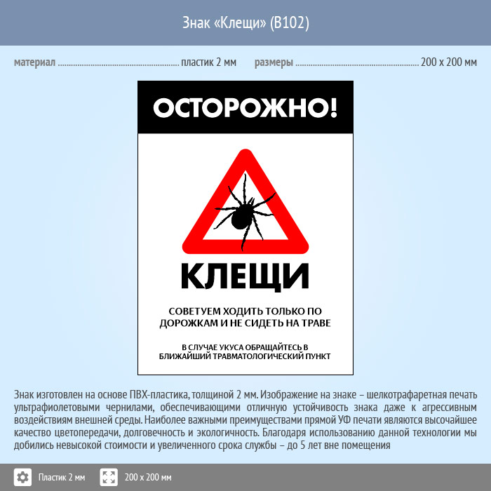 Знак «Осторожно! Клещи», B102 (пластик, 400х600 мм) в Пушкино купить