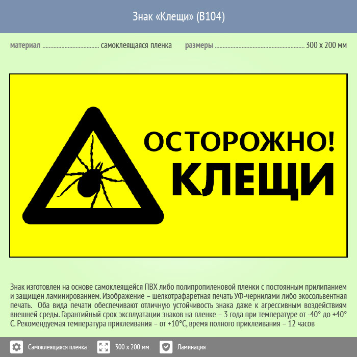 Знак «Осторожно! Клещи», B104 (пленка c ламинированием, 400х300 мм) в Пушкино купить