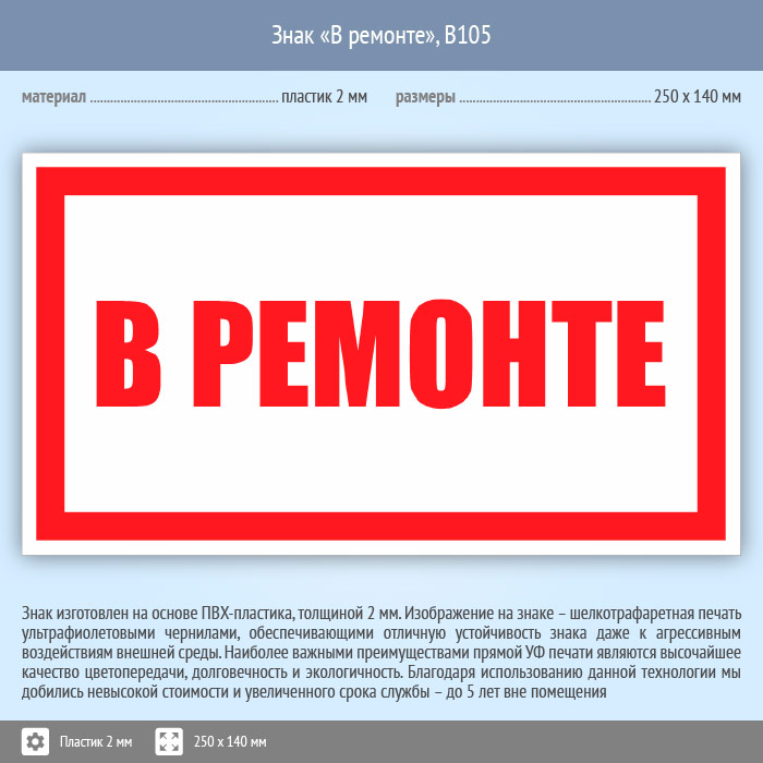 Знак «В ремонте», B105 (пластик, 250х140 мм) в Пушкино купить