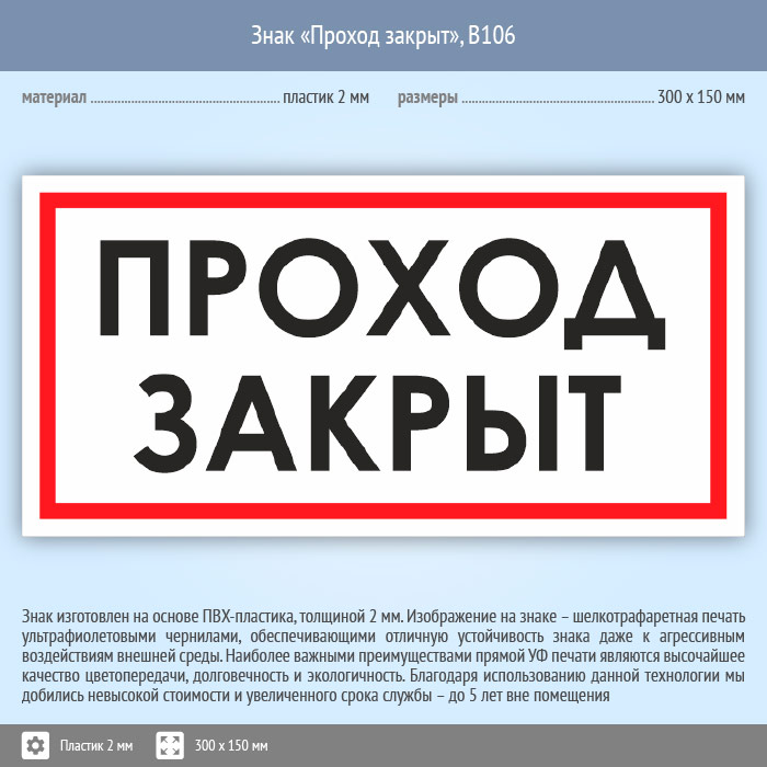 Знак «Проход закрыт», B106 (пластик, 300х150 мм) в Пушкино купить