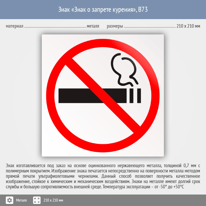 Знак «Знак о запрете курения», B73 (металл, 210х210 мм) в Пушкино купить