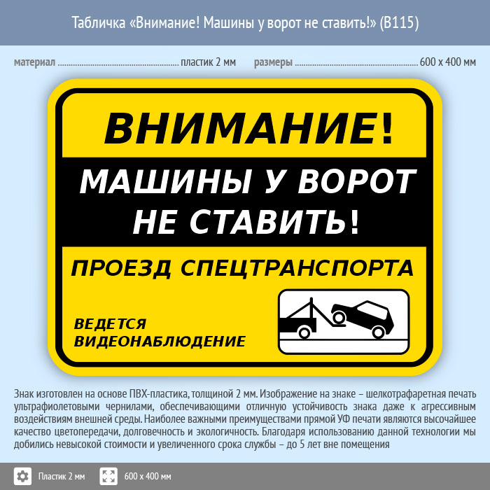 Табличка «Внимание! Машины у ворот не ставить!», B115 (пластик, 600х400 мм) в Пушкино купить