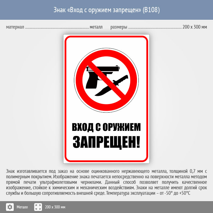 Знак «Вход с оружием запрещен», B108 (металл, 200х300 мм) в Пушкино купить