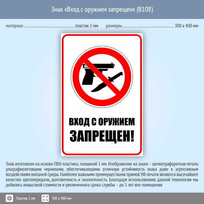 Знак «Вход с оружием запрещен», B108 (пластик, 300х400 мм) в Пушкино купить