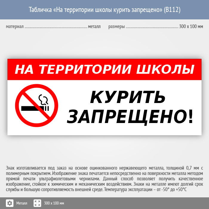 Табличка «На территории школы курить запрещено», B112 (металл, 300х100 мм) в Пушкино купить