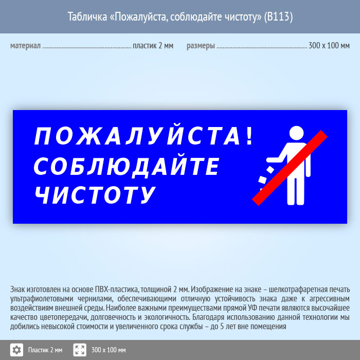Табличка «Пожалуйста, соблюдайте чистоту», B113 (пластик, 300х100 мм) в Пушкино купить