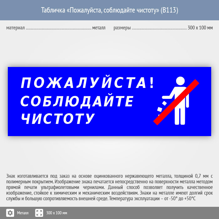 Табличка «Пожалуйста, соблюдайте чистоту», B113 (металл, 300х100 мм) в Пушкино купить