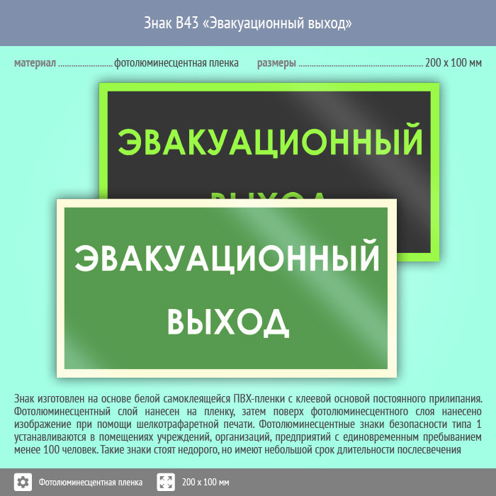 Знак B43 «Эвакуационный выход» (фотолюминесцентная пленка ГОСТ 34428-2018, 200х100 мм) в Пушкино купить