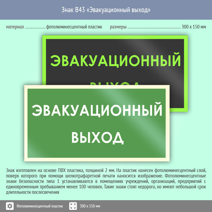 Знак B43 «Эвакуационный выход» (фотолюминесцентный пластик, 300х150 мм) в Пушкино купить