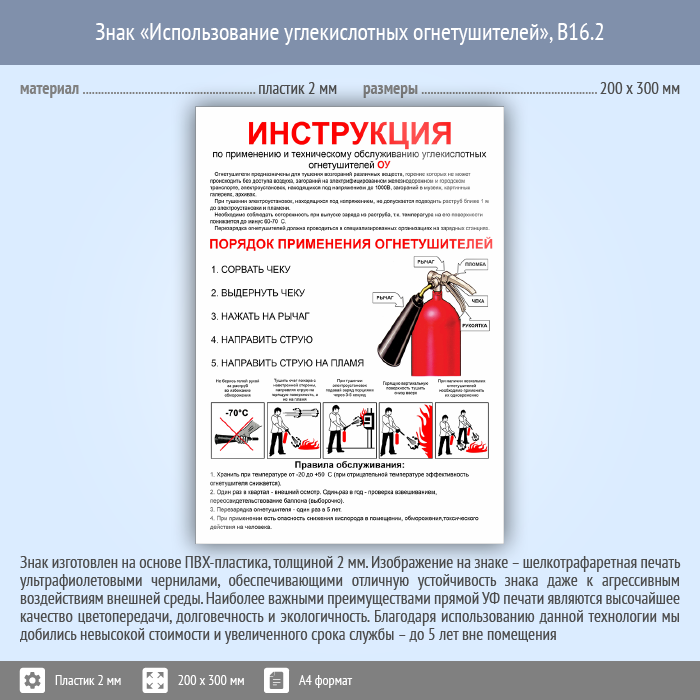 Знак «Использование углекислотных огнетушителей», B16.2 (пластик, 200х300 мм) в Пушкино купить