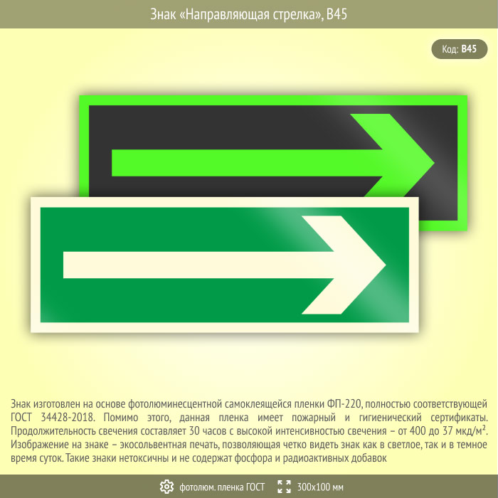 Знак «Направляющая стрелка», B45 (фотолюминесцентная пленка ГОСТ 34428-2018, 300х100 мм) в Пушкино купить