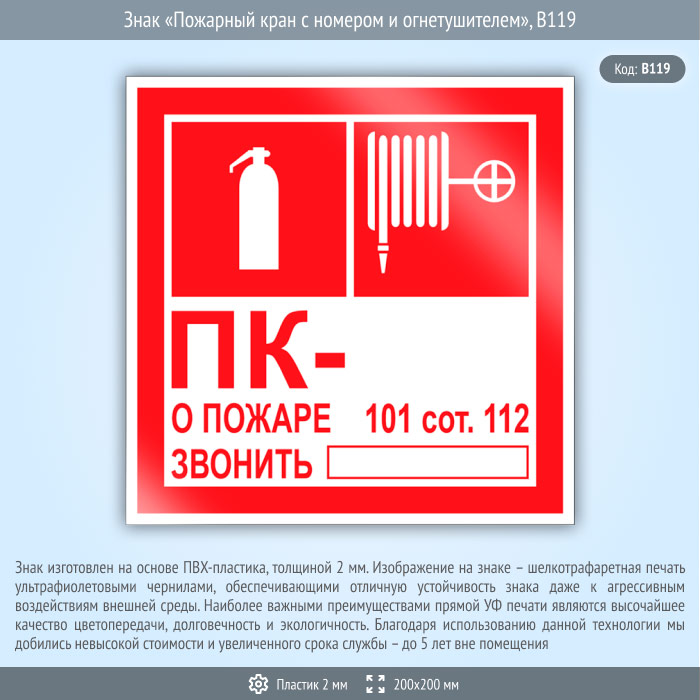 Знак «Пожарный кран с номером и огнетушителем», B119 (пластик, 200х200 мм) в Пушкино купить