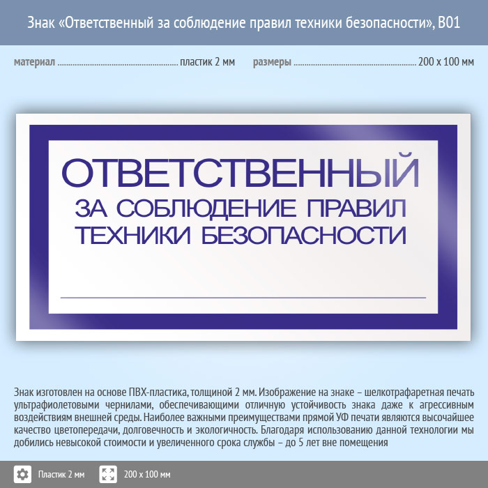 Знак «Ответственный за соблюдение правил техники безопасности», B01 (пластик, 200х100 мм) в Пушкино купить