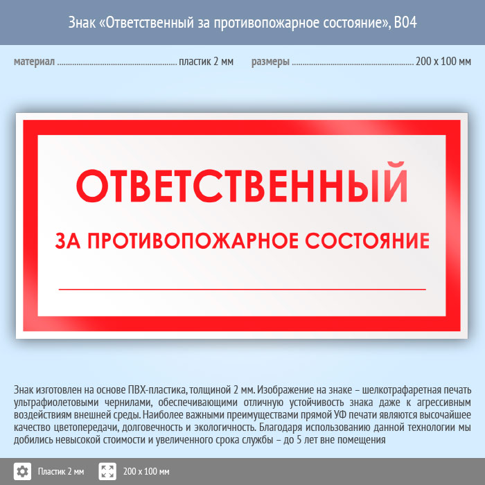 Знак «Ответственный за противопожарное состояние», B04 (пластик, 200х100 мм) в Пушкино купить