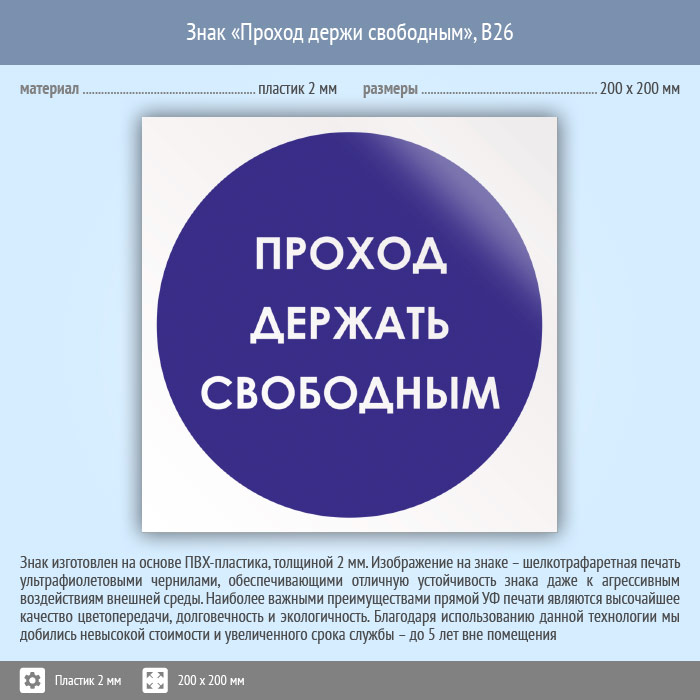 Знак «Проход держи свободным», B26 (пластик, 200х200 мм) в Пушкино купить