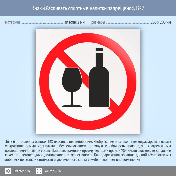 Знак «Распивать спиртные напитки запрещено», B27 (пластик, 200х200 мм) в Пушкино купить