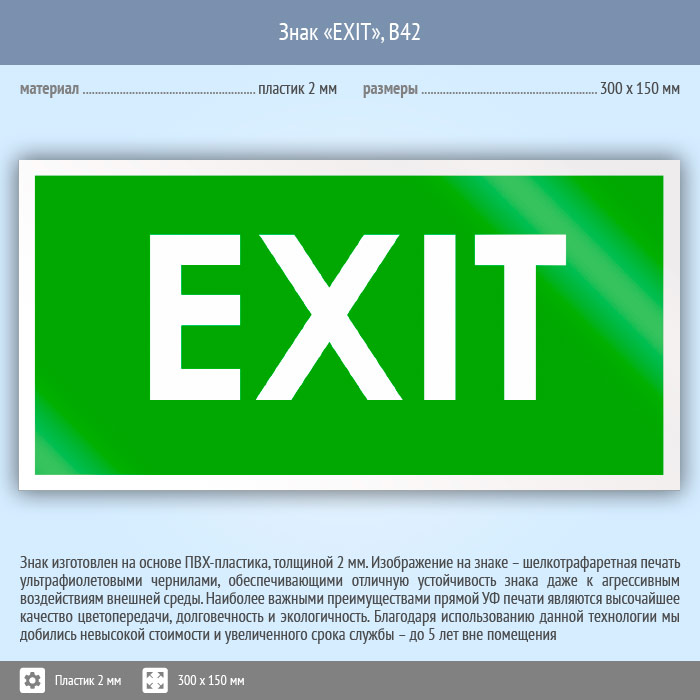Знак «EXIT», B42 (пластик, 300х150 мм) в Пушкино купить