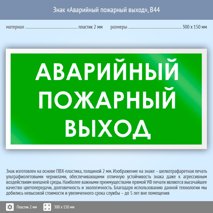 Знак «Аварийный пожарный выход», B44 (пластик, 300х150 мм) в Пушкино купить