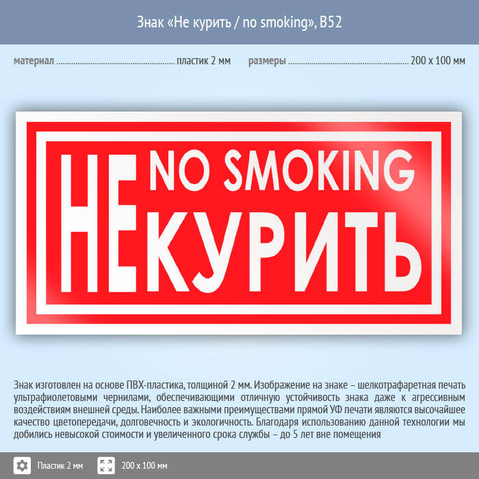 Знак «Не курить / no smoking», B52 (пластик, 200х100 мм) в Пушкино купить